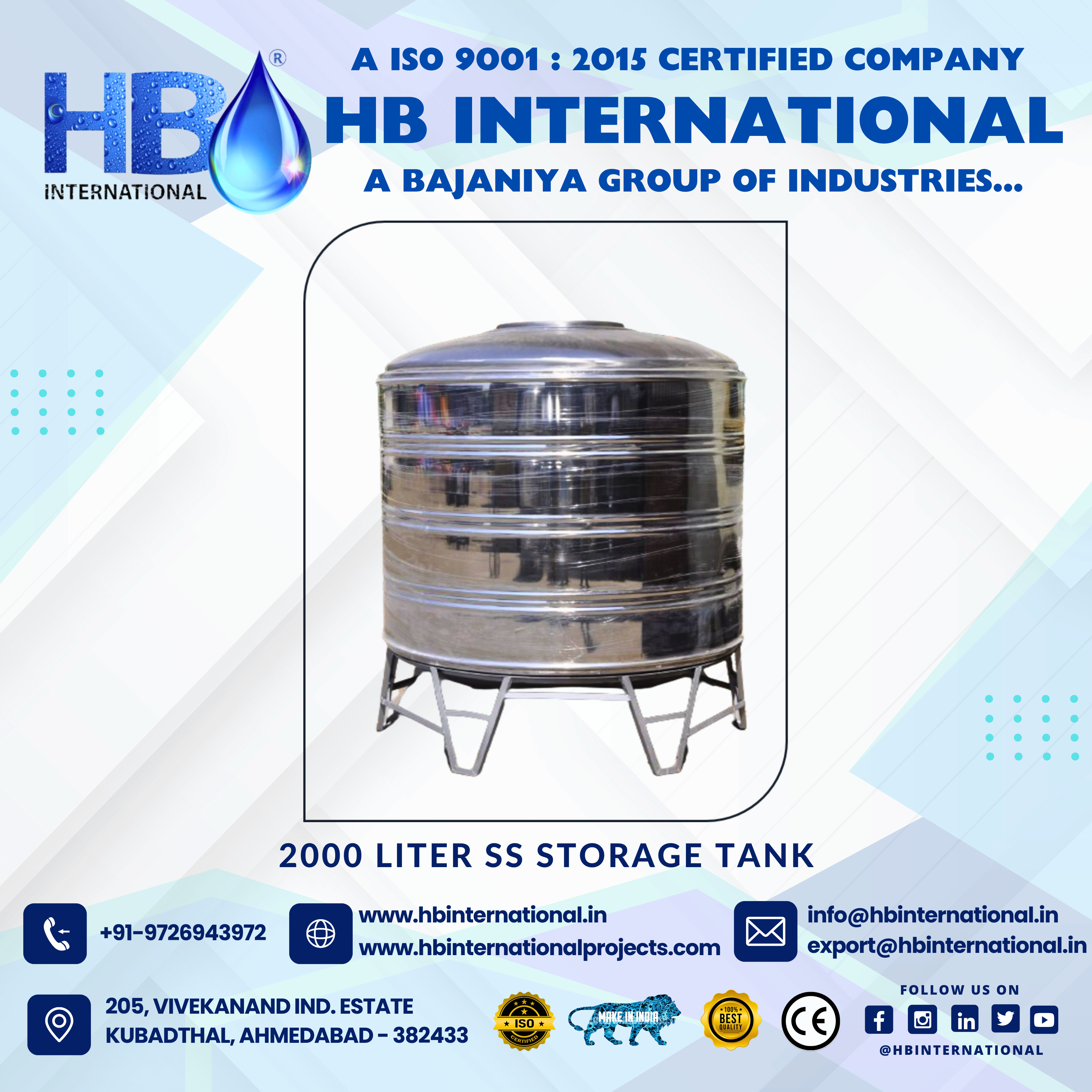 HB International manufactures premium-quality SS Tanks & Silo Tanks designed for storage of water, beverages, chemicals, and food-grade liquids. Built using SS304 / SS316 grade, our tanks ensure maximum hygiene, corrosion resistance, and long operational life.